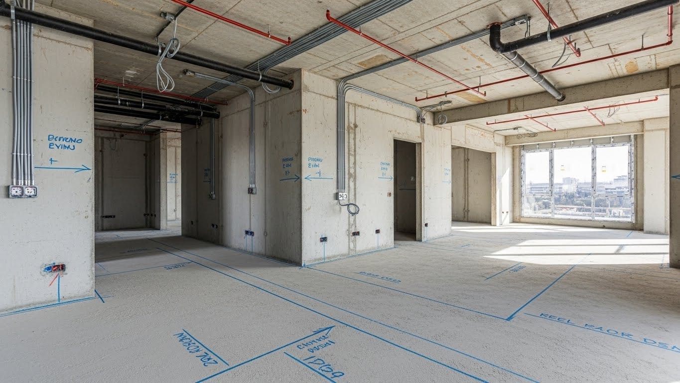 Es la fase estructural. Aquí se define “el esqueleto” del espacio. Es decir, los muros, vigas, pisos iniciales, instalaciones eléctricas y puntos hidráulicos. Este proceso incluye la construcción, derribo de paredes (si aplica), adecuación de tuberías, cableado eléctrico del espacio y ubicación de salidas, nivelación de pisos, preparación para domótica, ventanas, puertas, marcos, revisión estructural y distribución general.