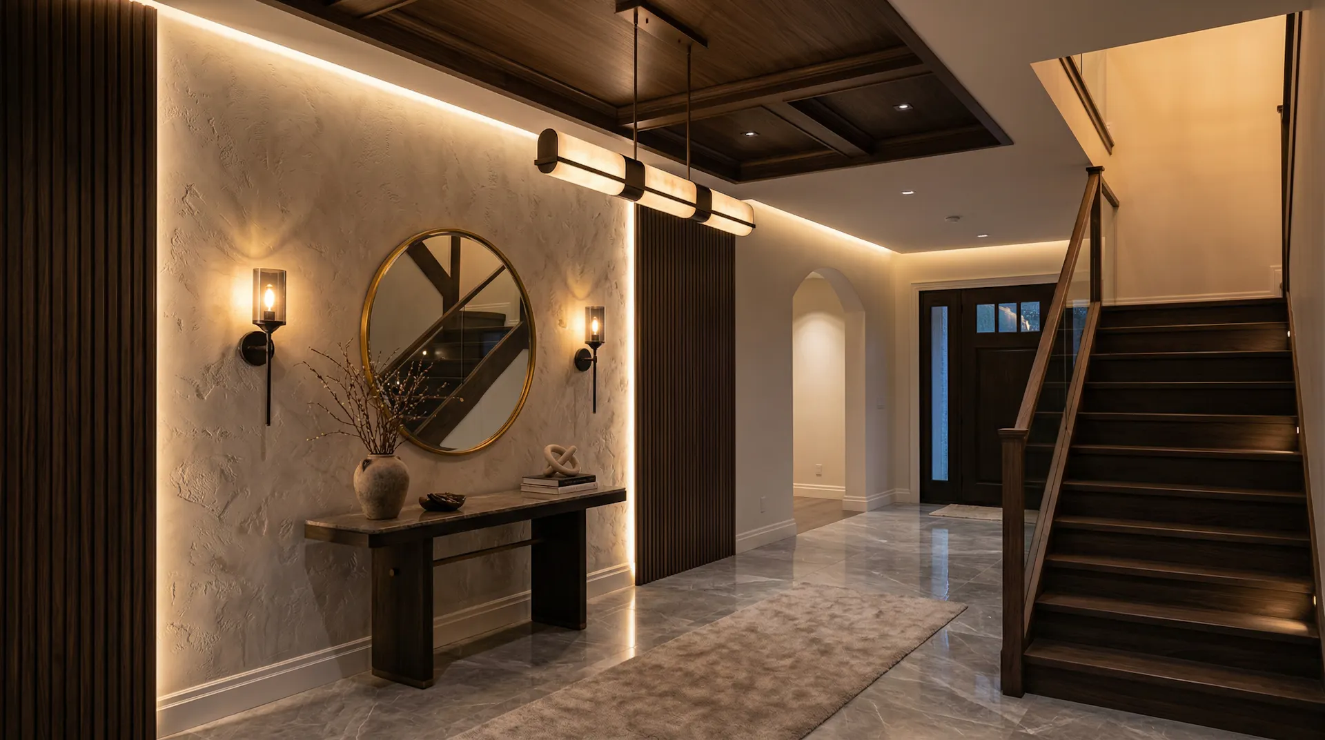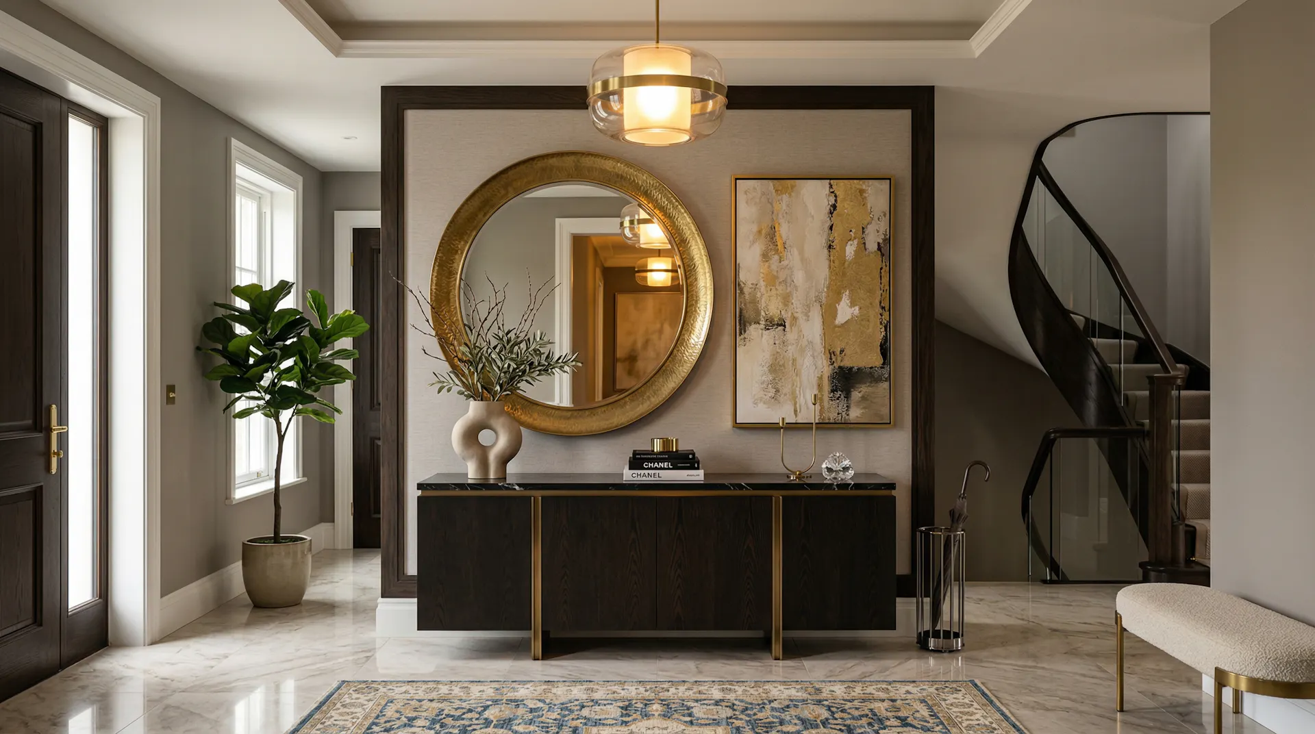 Todo espacio que impacta tiene un protagonista. Puede ser una consola con diseño especial, una obra de arte, un espejo de gran formato o un mueble a medida que marque la entrada. Este elemento guía la mirada y genera una primera impresión fuerte y memorable.